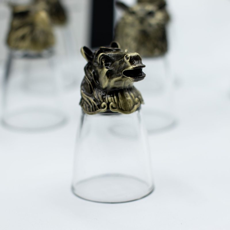 Each glass combines a transparent body with a finely detailed metal alloy base, featuring symbolic forest animals such as the Deer (strength & renewal), Wolf (loyalty & instinct), Fox (cunning & adaptability), and many more.